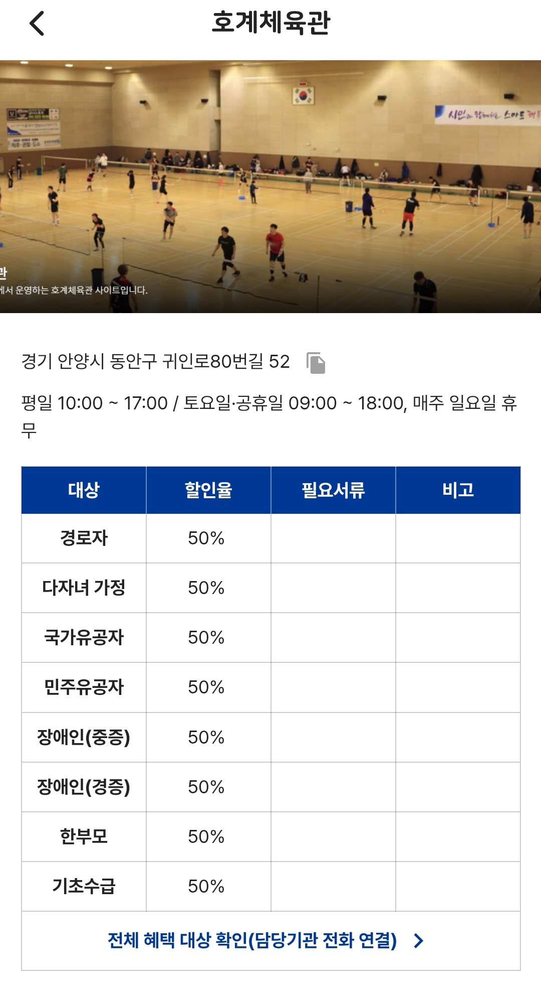 가까운 호계체육관도 역시 50% 할인 대상이더라고요.