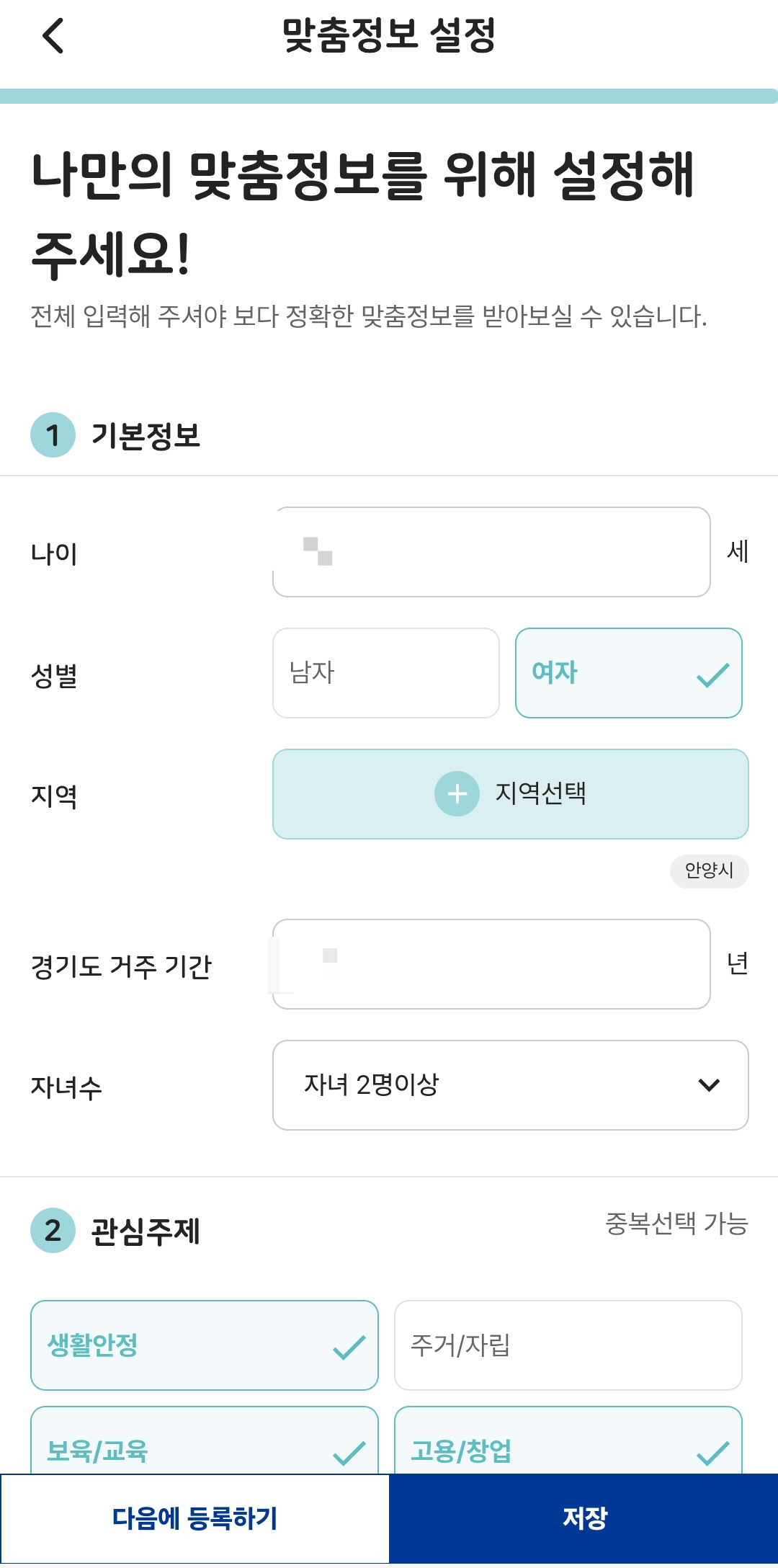 기본정보와 관심 주제만 설정하면