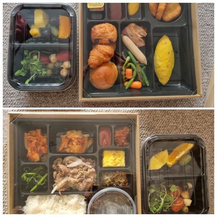 양식은 빵, 소시지, 베이컨, 오믈렛, 샐러드, 과일 등 구성되었고요. 한식은 밥, 미역국, 나물, 김치, 불고기, 계란말이, 멸치, 오징어젓갈, 메로구이, 샐러드, 과일 등이었습니다. 개인적으로 한식 도시락이 더 나았던 것 같았습니다.