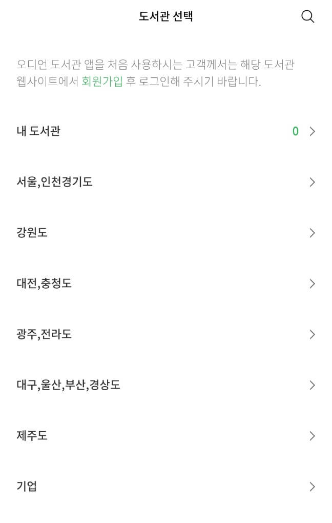 3. 오디언 도서관 어플 설치 후 접속하시면 도서관 선택을 해야 합니다.