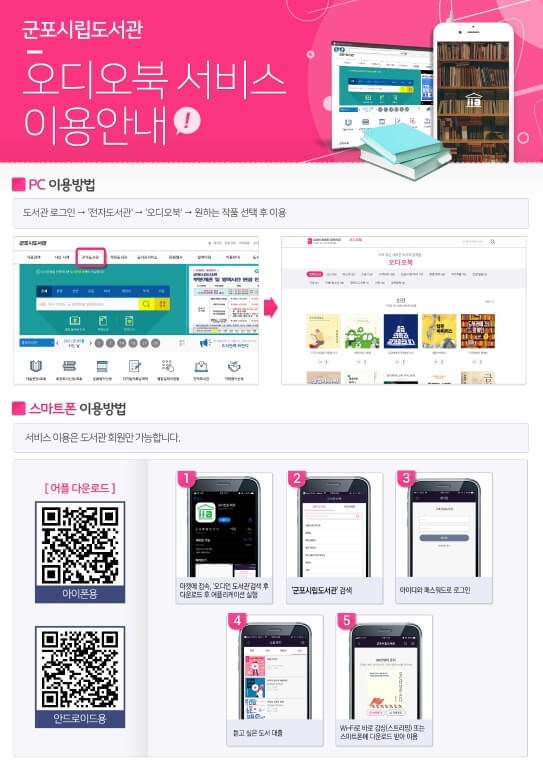 ▶ 이용방법 : 도서관 홈페이지 회원가입 후 로그인하여 오디오북 서비스 이용