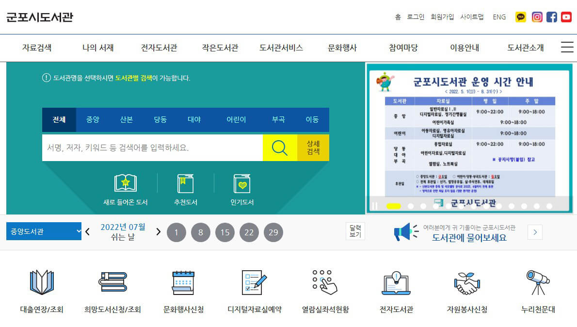 저는 군포시에 거주중이라 군포시 도서관 홈페이지 회원으로 가입이 되어 있습니다. 공공도서관 홈페이지에 먼저 가입이 되어 있어야 이용이 가능합니다.